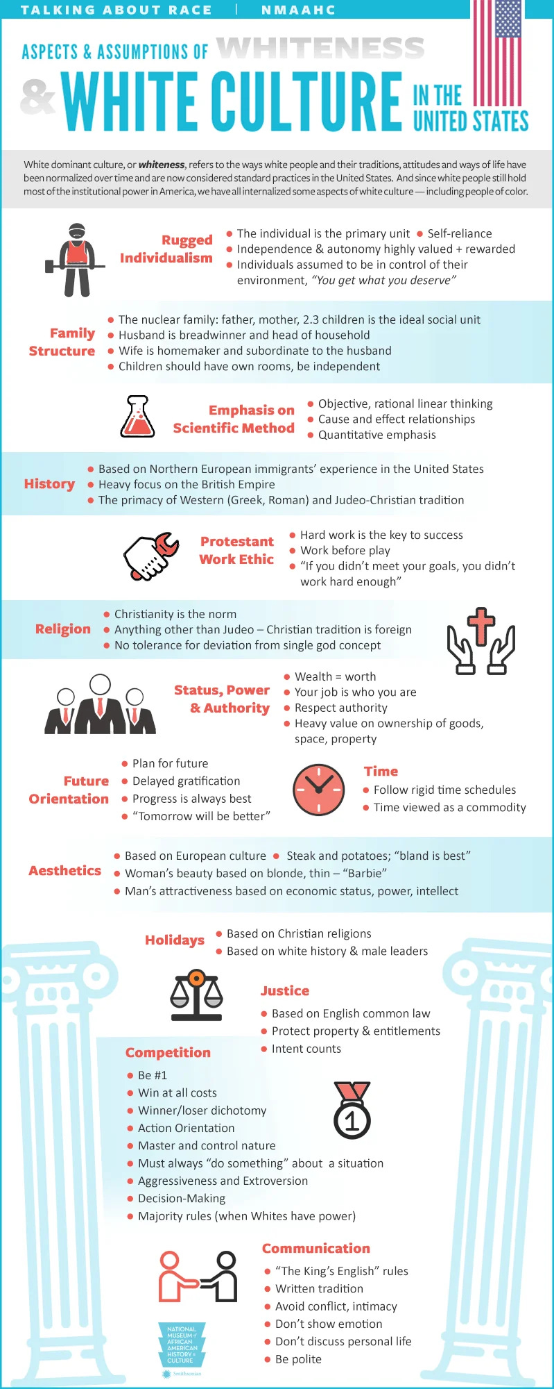 Recently, the Smithsonian’s National Museum of African American History and Culture published an infographic titled “Aspects and Assumptions of Whiteness & White Culture in the United States” . On page 1, the graphic lists traits such as rugged individualism, the scientific method, the Protestant work ethic, delayed gratification, planning for the future, respect for authority, competition, and adherence to English common law. These are presented as elements of “whiteness” or “white dominant culture.” The suggestion is unmistakable. These attributes are not simply virtues or civilizational tools. They are racially coded.